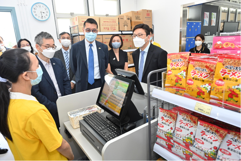 The Secretary for Labour and Welfare, Mr Chris Sun, today (October 7) officiated at the Opening Ceremony of Shine Skills Centre (Kwun Tong) - Oxford Road Re-provisioned Campus of the Vocational Training Council. Photo shows Mr Sun (front row, first right) chatting with a trainee in a simulated convenience store at the commercial and retailing service training workshop.