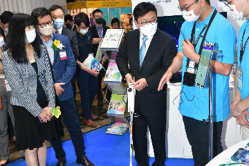 The Secretary for Labour and Welfare, Mr Chris Sun, officiated at the opening ceremony of the Hong Kong Trade Development Council Education & Careers Expo 2022 today (July 21). Photo shows Mr Sun (centre) at the Vocational Training Council booth, using a Smart Cane "iStick" which applies various technological elements.