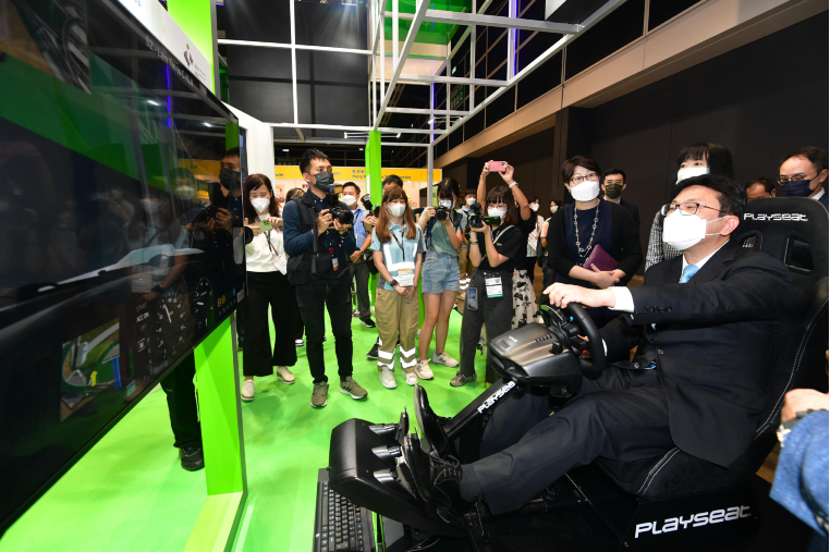 The Secretary for Labour and Welfare, Mr Chris Sun, officiated at the opening ceremony of the Hong Kong Trade Development Council Education & Careers Expo 2022 today (July 21). Photo shows Mr Sun (first right) in a demonstration applying the 3D BIM Technology and Visualisation Techniques at the Hong Kong Institute of Construction booth.