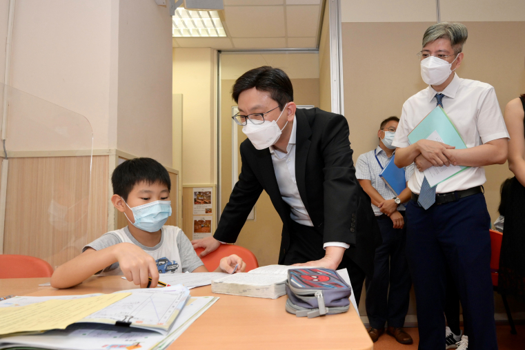 The Secretary for Labour and Welfare, Mr Chris Sun, visited elderly community care and After School Care Programme (ASCP) service centres on September 16 to keep abreast of care services for the young and old. Photo shows Mr Sun (centre) chatting with a student attending the ASCP for primary school students at Chinese Evangelical Zion Church Tsz Wan Shan Zion Children and Youth Integrated Services Centre.