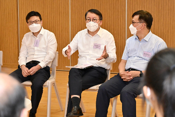 The Chief Secretary for Administration, Mr Chan Kwok-ki (centre), accompanied by the Secretary for Labour and Welfare, Mr Chris Sun (left), visited Caritas Community Centre - Tsuen Wan today (July 26). They chatted to parents and students from several grassroots families living in subdivided units to understand their living conditions as well as their views on how the current-term Government can support the development of students from grassroots families.
