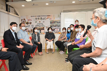 The Secretary for Labour and Welfare, Mr Chris Sun, visited elderly community care and After School Care Programme service centres on September 16 to keep abreast of care services for the young and old. Photo shows Mr Sun (first right), accompanied by the Chairman of the Lok Sin Tong Benevolent Society, Kowloon, Mr Chan Kin-ping (fourth left), and the Assistant Director of Social Welfare (Elderly), Mr Tan Tick-yee (third left), listening to an elderly person sharing on the care and rehabilitation training in his visit to Lok Sin Tong Biu Chun Day Care Centre for the Elderly.