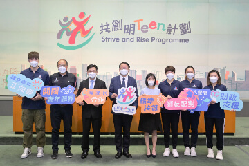The Chief Secretary for Administration, Mr Chan Kwok-ki, held a press conference today (August 22) on the Strive and Rise Programme launched by the Task Force to Lift Underprivileged Students out of Intergenerational Poverty at the Central Government Offices, Tamar. Photo shows the following at the press conference: Mr Chan (fourth left); the Secretary for Labour and Welfare, Mr Chris Sun (third left); the Director of Social Welfare, Miss Charmaine Lee (fourth right); the Chairman of the Board of Directors of the Hong Kong Sports Institute, Dr Lam Tai-fai (second left); and Star Mentors of the programme - elite athletes Cheung Ka-long (first left), Doo Hoi-kem (third right), Soo Wai-yam (second right) and Lee Ho-ching (first right).