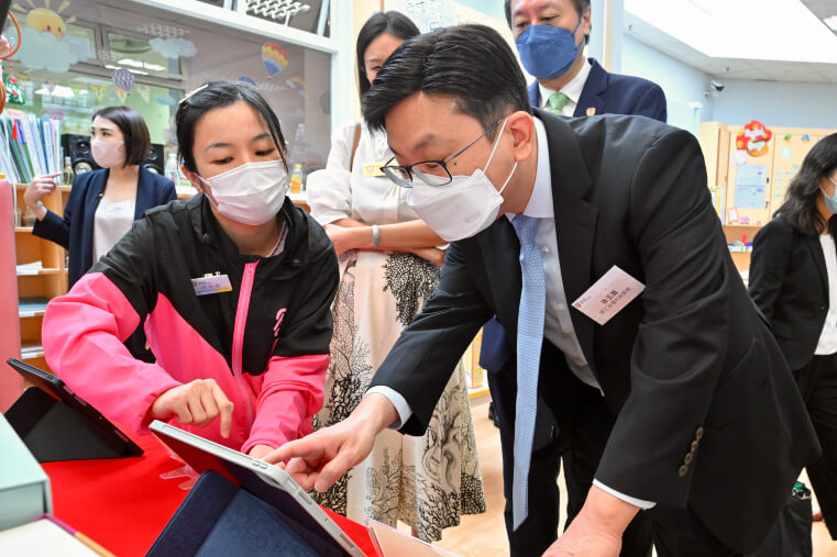 The Secretary for Labour and Welfare, Mr Chris Sun, visited elderly community care and After School Care Programme (ASCP) service centres on September 16 to keep abreast of care services for the young and old. Photo shows Mr Sun (back row, first right), accompanied by the Director of Social Welfare, Miss Charmaine Lee (back row, second right), watching pre-primary children attending the ASCP at Chinese Evangelical Zion Church Grace After School Care Centre for Pre-primary Children.