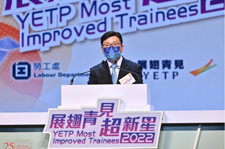 The Award Ceremony of Most Improved Trainees of the Youth Employment and Training Programme 2022 was held at Queen Elizabeth Stadium this evening (August 26). Photo shows the Secretary for Labour and Welfare, Mr Chris Sun, delivering a speech at the ceremony.