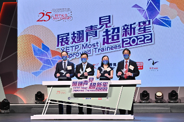 The Award Ceremony of Most Improved Trainees of the Youth Employment and Training Programme 2022 was held at Queen Elizabeth Stadium this evening (August 26). Photo shows the Secretary for Labour and Welfare, Mr Chris Sun (second left); the Permanent Secretary for Labour and Welfare, Ms Alice Lau (second right); the Acting Director of Broadcasting, Mr Raymond Sy (first left); and the Deputy Commissioner for Labour (Labour Administration), Mr Raymond Ho (first right), officiating at the opening ceremony.