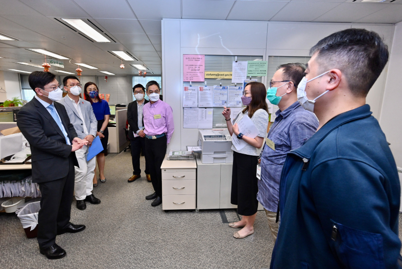 The Secretary for Labour and Welfare, Mr Chris Sun, visited the service centre of Blue Sky Short-term Food Assistance Service Team of Po Leung Kuk (PLK) in Yuen Long this afternoon (August 30) to take a closer look at the latest situation after its regularisation from August 2021. The Director of Social Welfare, Miss Charmaine Lee, also joined the visit. Photo shows Mr Sun (front row, first right) and Miss Lee (front row, third right) being briefed by the Chief Executive Officer of PLK, Ms Anissa Wong (front row, second right), on the various types of assistance provided by the Service Team.