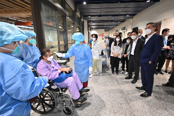 The Secretary for Labour and Welfare, Mr Chris Sun, today (September 1) visited the Kai Tak Quarantine Centre at the Kai Tak Cruise Terminal to learn more about the preparatory work prior to its commencement of operation tomorrow (September 2). Photo shows Mr Sun (front row, second right), accompanied by the Director of Social Welfare, Miss Charmaine Lee (front row, third right), and the Chief Executive Officer of Haven of Hope Christian Service, Dr Lam Ching-choi (front row, first right), watching a demonstration by staff of the care team on admission procedures for a resident of a residential care home for the elderly, including taking her body temperature first.