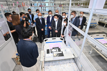 The Secretary for Labour and Welfare, Mr Chris Sun, visited the Jockey Club "age at home" Gerontech Education and Rental Service Centre, and the Gerontech Cleaning and Maintenance Service Centre (CMSC) this afternoon (September 8) to keep abreast of their latest services. The Under Secretary for Labour and Welfare, Mr Ho Kai-ming, and the Director of Social Welfare, Miss Charmaine Lee, also joined the visits. Photo shows Mr Sun (front row, second right), accompanied by Miss Lee (front row, third right) and the Chief Executive of the Hong Kong Council of Social Service, Mr Chua Hoi-wai (front row, first right), watching how equipment are cleaned and disinfected thoroughly in the CMSC.