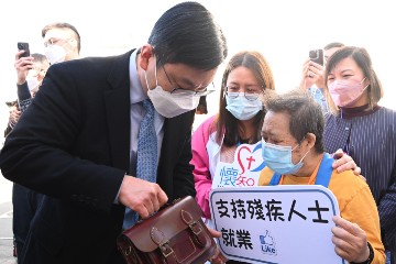 The Secretary for Labour and Welfare, Mr Chris Sun, accompanied by the Director of Social Welfare, Miss Charmaine Lee; the Commissioner for Rehabilitation, Miss Vega Wong; and the Chairperson of the Advisory Committee on Enhancing Employment of People with Disabilities, Dr Kevin Lau, visited the 56th Hong Kong Brands and Products Expo at Victoria Park today (December 22). Photo shows Mr Sun (second left) and Miss Lee (second right) being briefed by a person with disabilities to learn about their products.