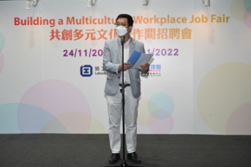 The kick-off ceremony for the Building a Multicultural Workplace Job Fair was held at Southorn Stadium today (November 24). Photo shows the Under Secretary for Labour and Welfare, Mr Ho Kai-ming, delivering his speech at the ceremony.