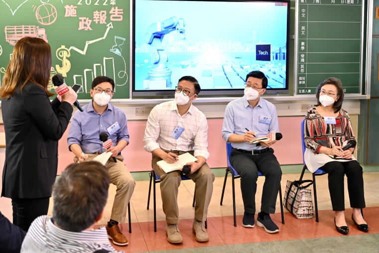 The Chief Executive, Mr John Lee, attended the 2022 Policy Address Consultation District Forum with some Principal Officials this afternoon (August 20) to listen to views and suggestions of local community members on the upcoming Policy Address. Photo shows Mr Lee (third left); the Deputy Chief Secretary for Administration, Mr Cheuk Wing-hing (second left); the Secretary for Development, Ms Bernadette Linn (fourth left); and the Secretary for Labour and Welfare, Mr Chris Sun (first left), exchanging views with the public.
