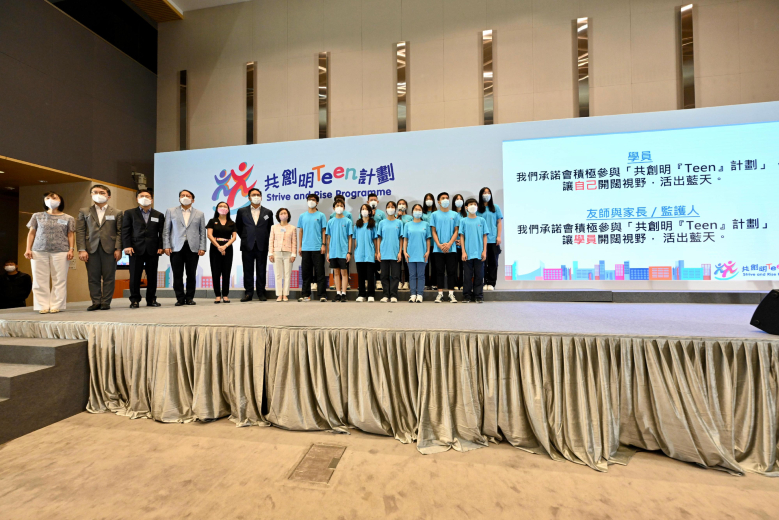 The Chief Secretary for Administration, Mr Chan Kwok-ki, attended the Kick-off Ceremony and Orientation Day of the Strive and Rise Programme today (October 29). Photo shows Mr Chan (fourth left), accompanied by the Secretary for Labour and Welfare, Mr Chris Sun (third left); the Permanent Secretary for Labour and Welfare, Ms Alice Lau (fifth left); the Under Secretary for Education, Mr Sze Chun-fai (second left); the Under Secretary for Home and Youth Affairs, Mr Clarence Leung (sixth left); the Director of Social Welfare, Miss Charmaine Lee (first left); and the Director of Home Affairs, Mrs Alice Cheung (seventh left), witnessed the oath-taking of mentees, parents and mentors.