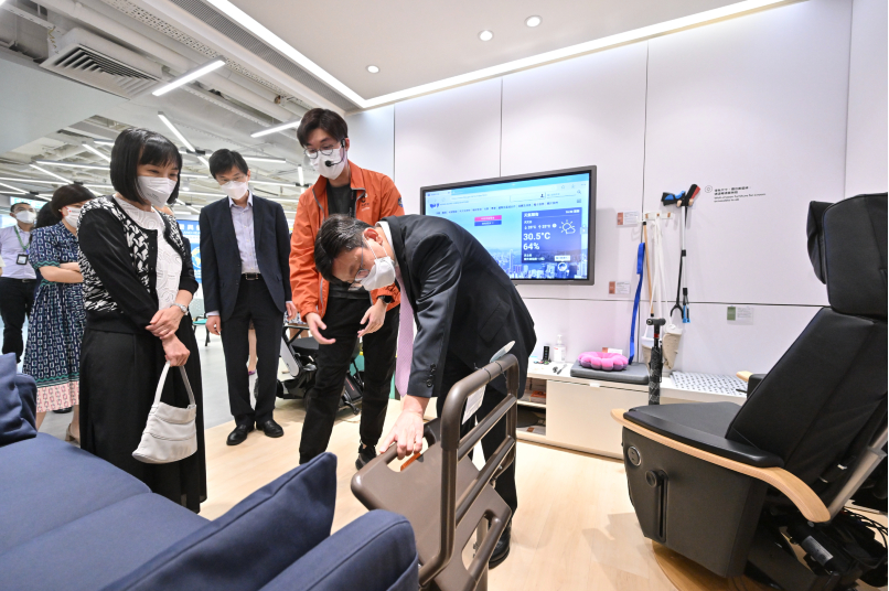The Labour and Welfare Bureau, the Department of Social Affairs of the Liaison Office of the Central People's Government in the Hong Kong Special Administrative Region, the Social Welfare Department and the Hong Kong Social Welfare Sector Joint Action Against COVID-19 jointly organised training workshops on the spirit of the 20th National Congress of the Communist Party of China for the local social welfare sector from November 20 to 29. A summary and sharing session was held today (December 3) in hybrid mode in both physical and online formats. Exhibits were featured at the venue to showcase the social welfare services in Hong Kong. Photo shows the Secretary for Labour and Welfare, Mr Chris Sun (first left) and the Director of Social Welfare, Miss Charmaine Lee (second left), viewing exhibits of gerontechnology.