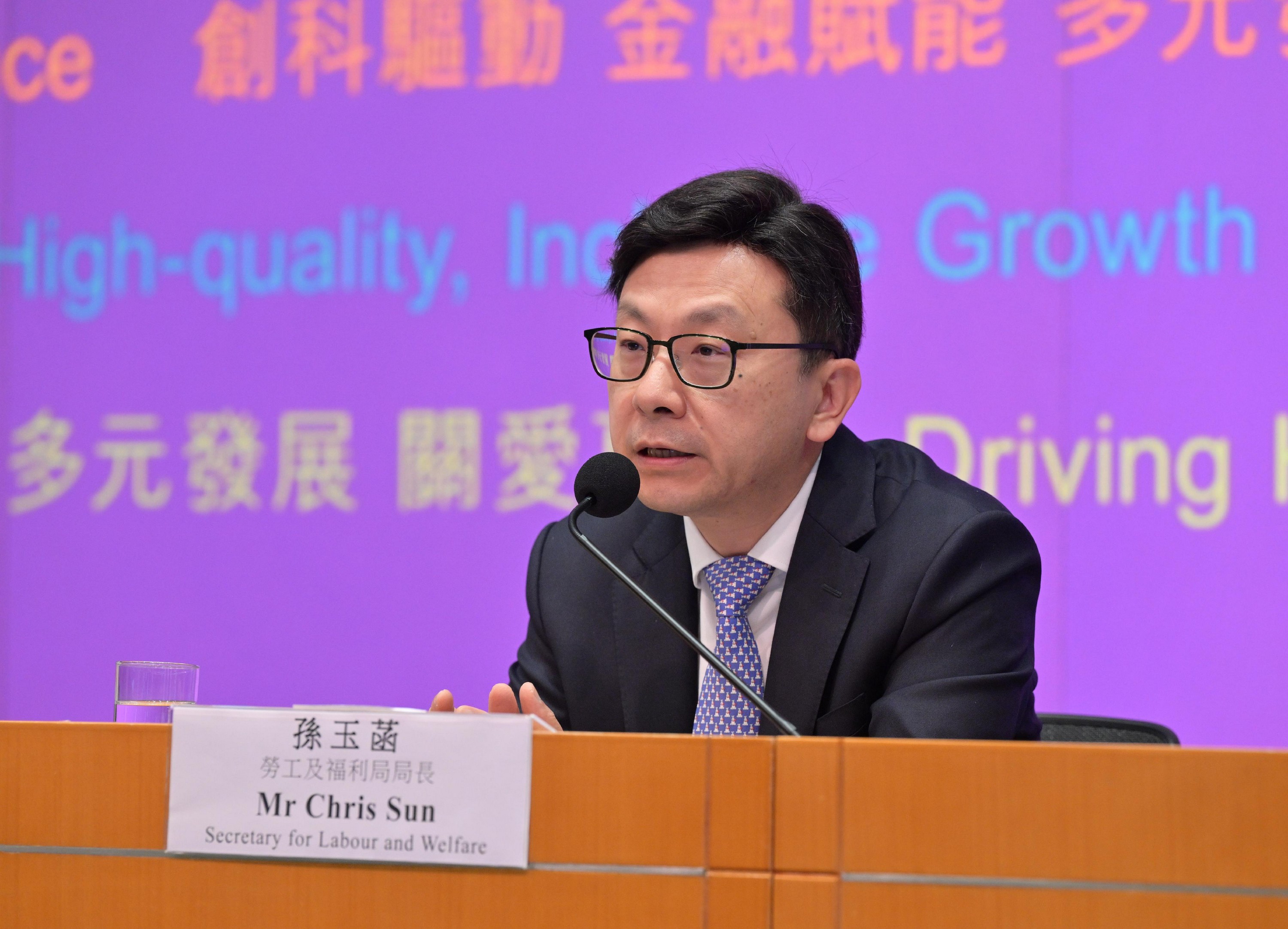 The Secretary for Labour and Welfare, Mr Chris Sun, elaborates on details of initiatives related to the Labour and Welfare Bureau at a press conference on the 2026-27 Budget initiatives today (February 27).
