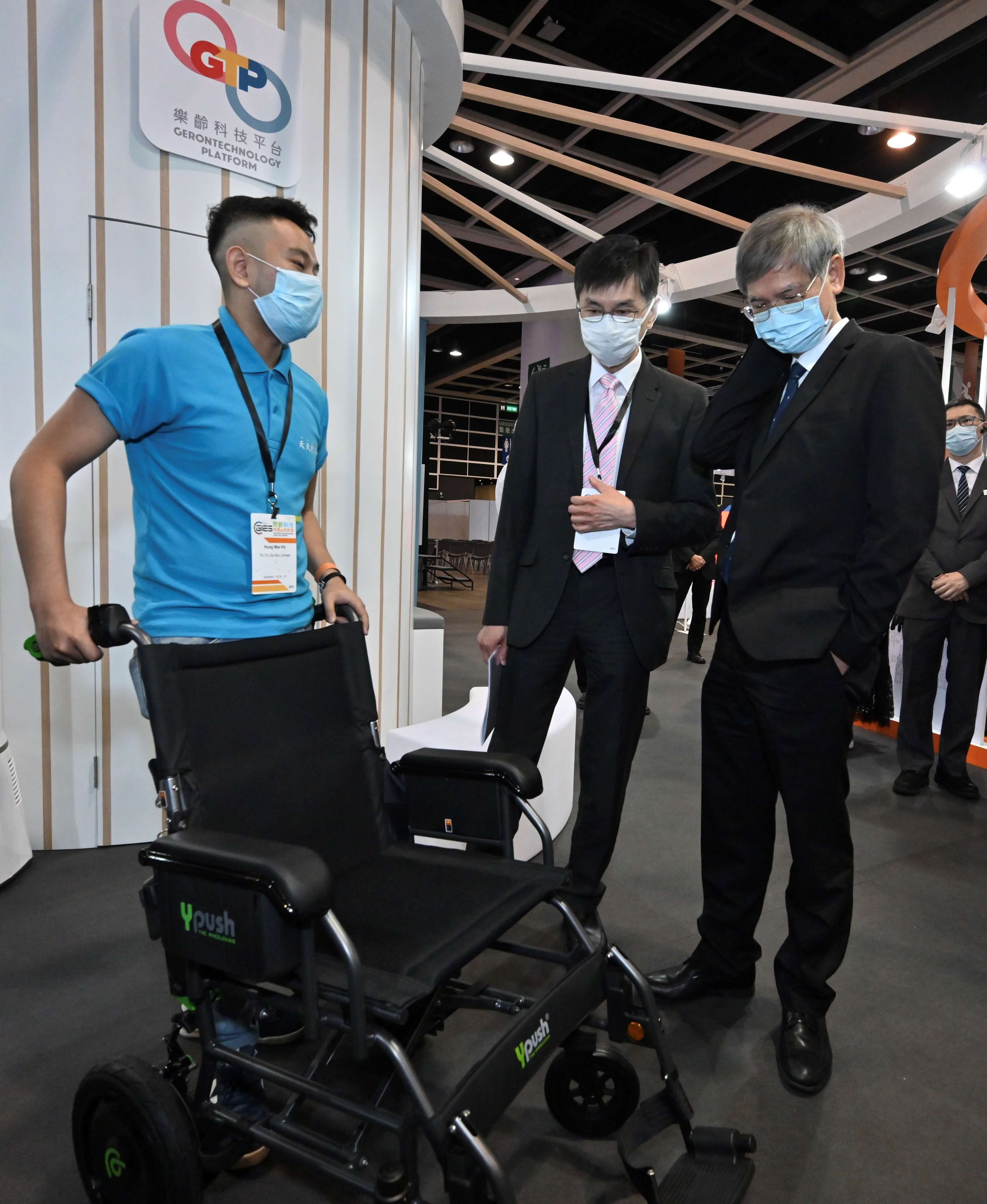 劳工及福利局局长罗致光博士日前出席乐龄科技博览暨高峰会2021开幕礼主礼。图示罗致光博士(右)及社联行政总裁蔡海伟(中)在「智慧城市 优质服务」主题馆,听取职员介绍由社会创新及创业发展基金资助的乐龄科技平台及展品。