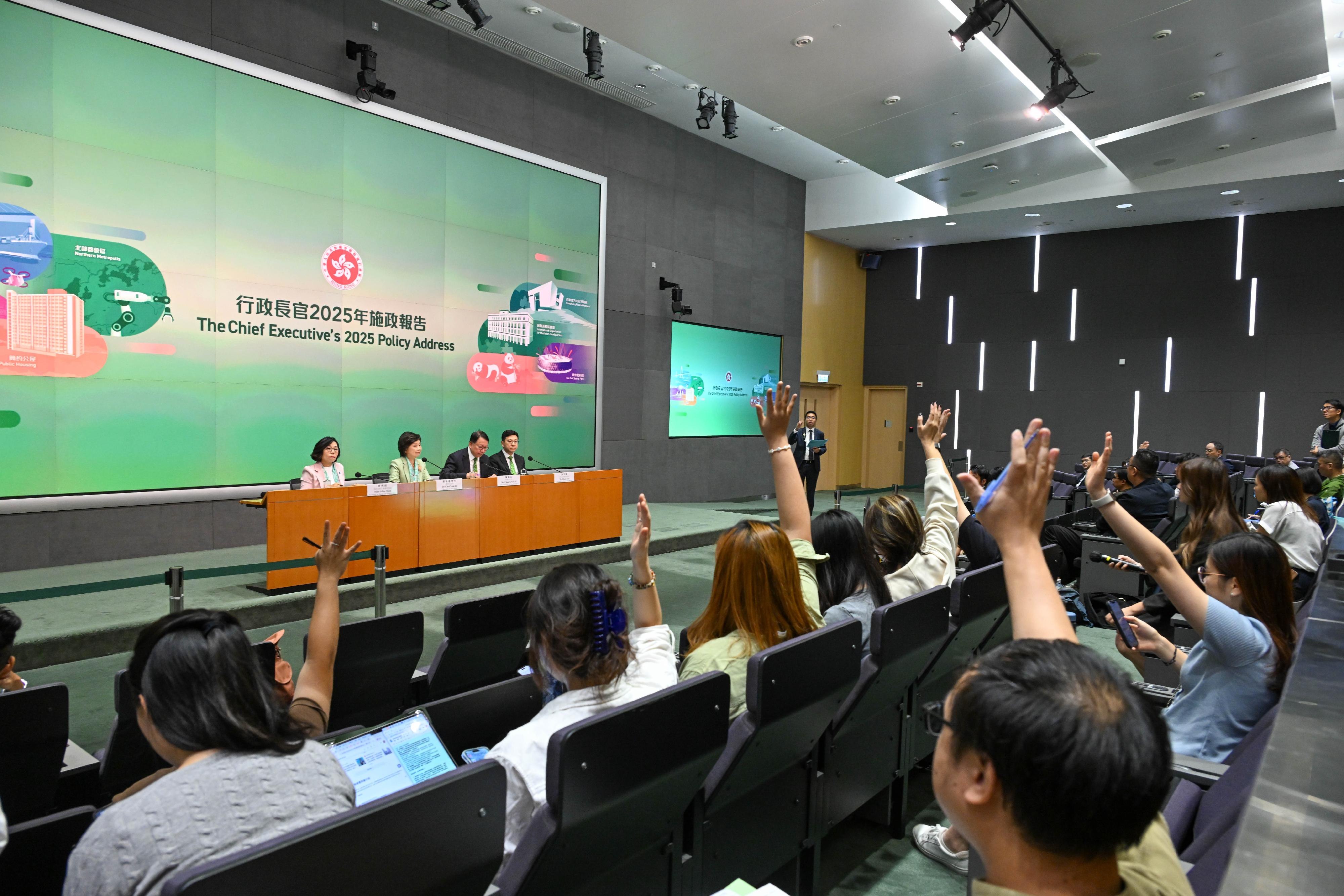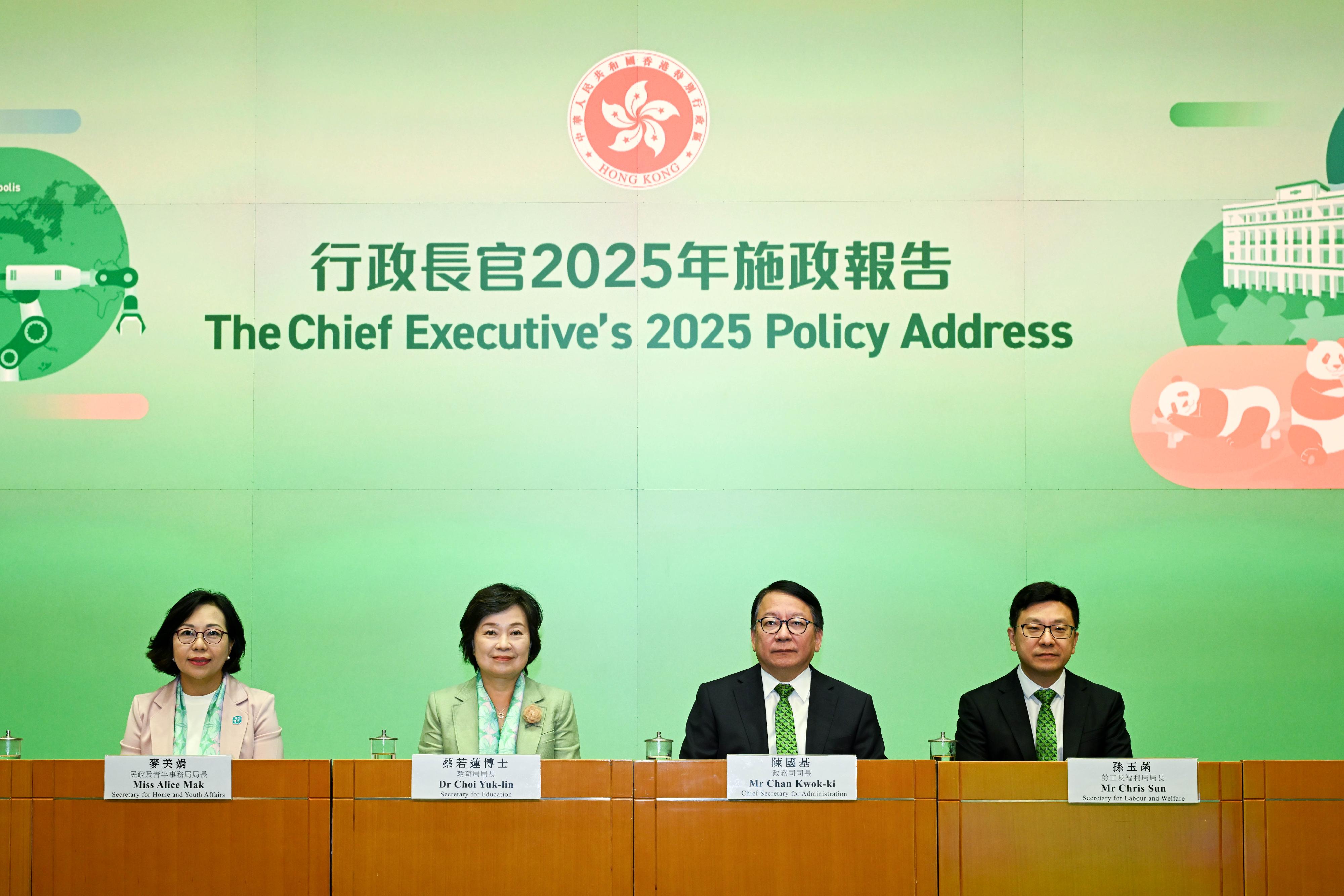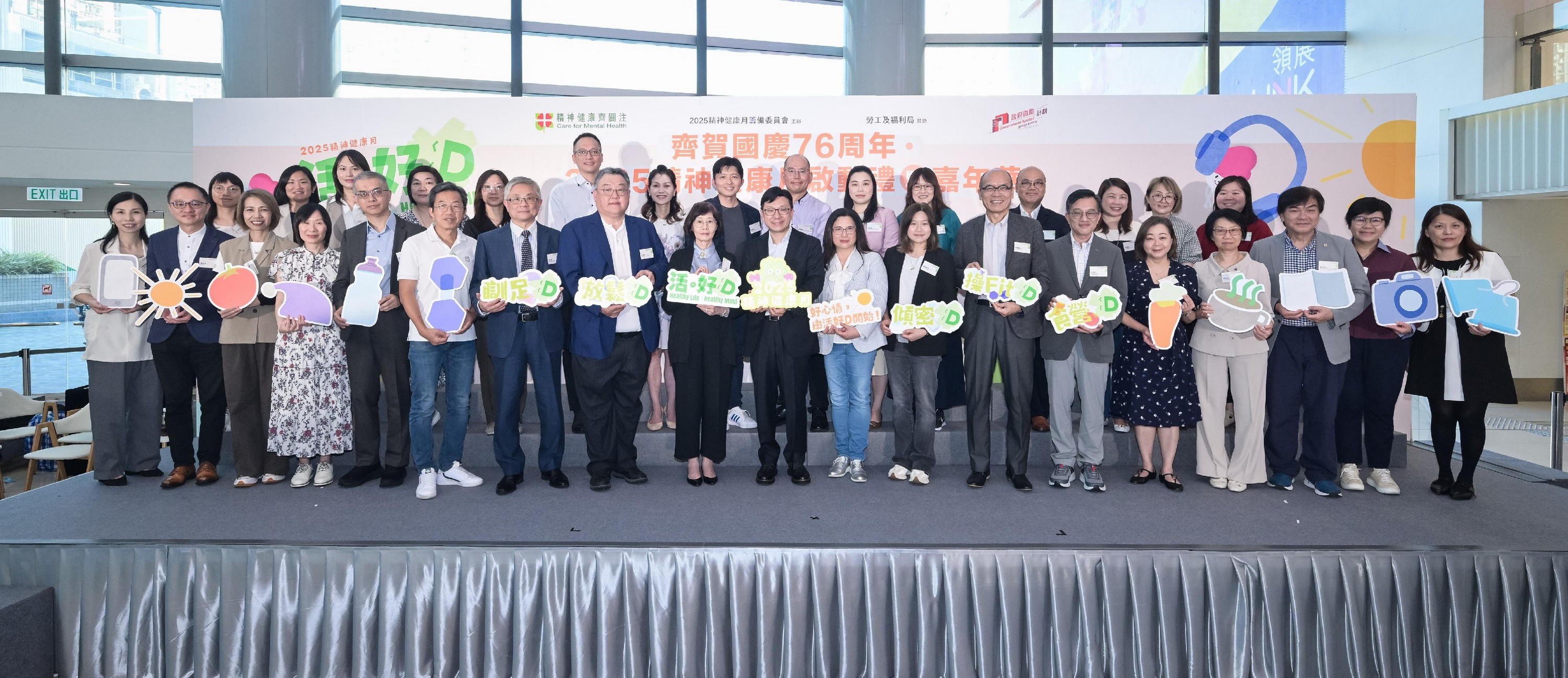 勞工及福利局局長孫玉菡今日(十月十一日)為「齊賀國慶76周年.2025精神健康月啟動禮暨嘉年華」主禮。精神健康月由勞工及福利局聯同多個決策局/部門、公營機構及非政府機構合辦,以響應世界心理衞生聯盟發起的「世界精神衞生日」。2025精神健康月以「活.好D」為主題,希望透過不同形式的公眾教育及推廣活動,提升市民對健康生活方式的認識與重視。圖示孫玉菡(前排中)與一眾主禮嘉賓及合辦機構代表合照。