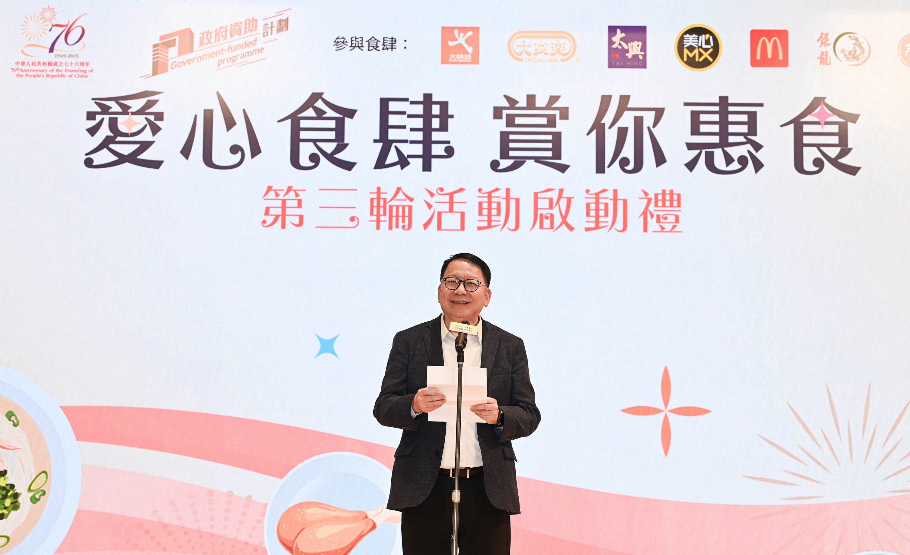 政府今日(一月十四日)舉辦「愛心食肆 賞你惠食」啓動禮,向有需要長者派發餐飲優惠券,傳達社會對長者的關懷。圖示政務司司長陳國基在啓動禮致辭。