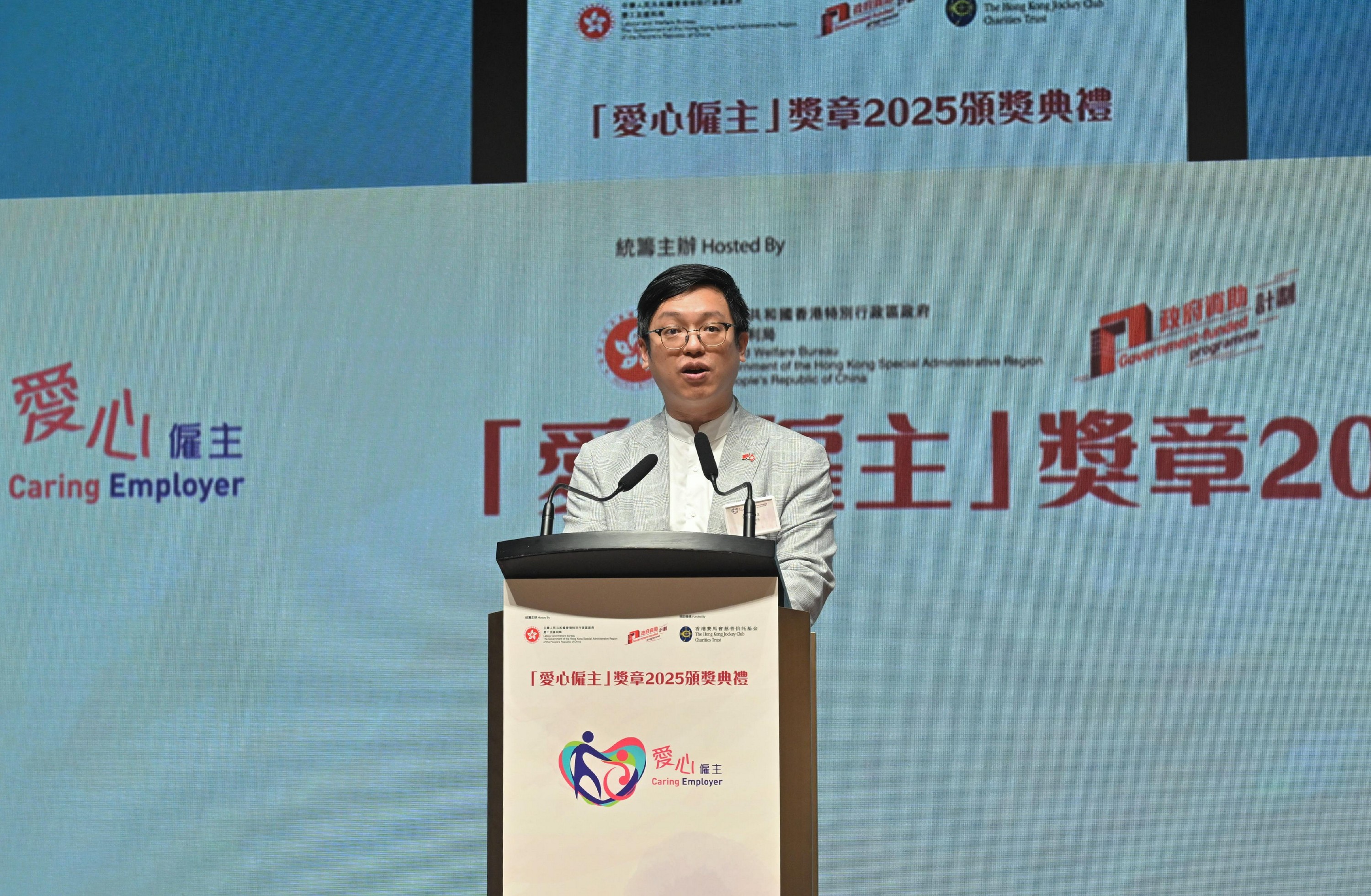 勞工及福利局(勞福局)今日(十月十日)舉辦「愛心僱主」獎章2025頒獎典禮。圖示勞福局副局長何啟明在典禮上致辭。