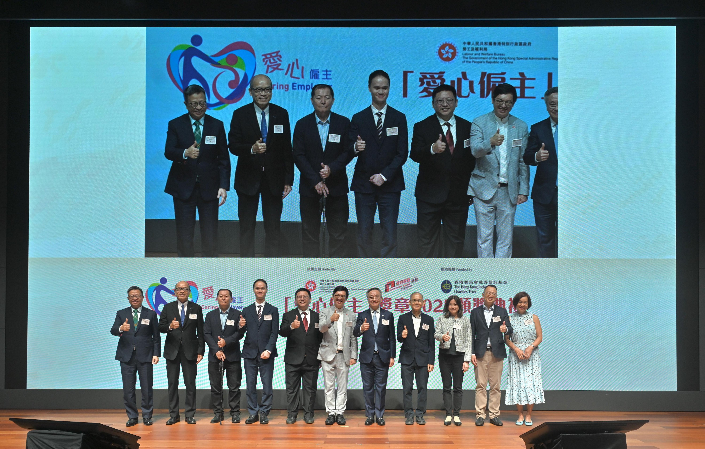 勞工及福利局(勞福局)今日(十月十日)舉辦「愛心僱主」獎章2025頒獎典禮。圖示勞福局副局長何啟明(中)和香港賽馬會董事羅啟華(右五)與一眾嘉賓合照。