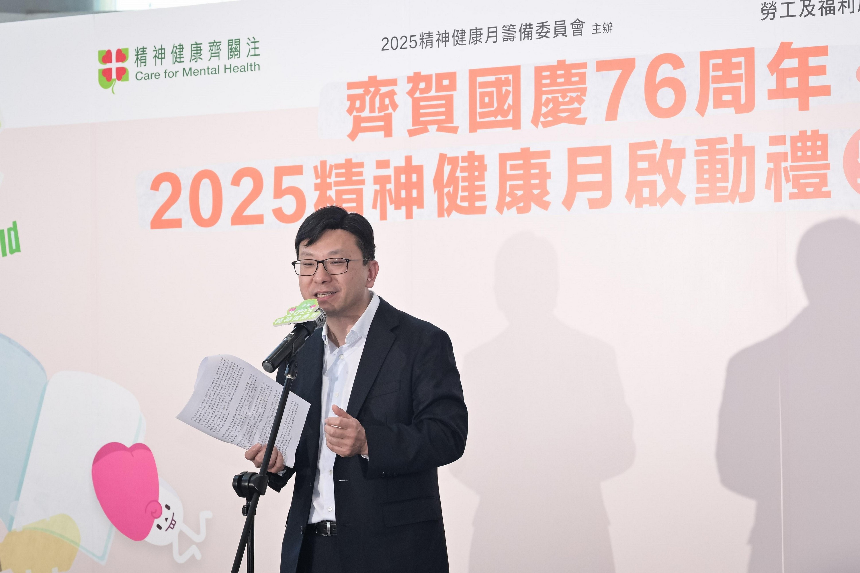 勞工及福利局局長孫玉菡今日(十月十一日)為「齊賀國慶76周年.2025精神健康月啟動禮暨嘉年華」主禮。精神健康月由勞工及福利局聯同多個決策局/部門、公營機構及非政府機構合辦,以響應世界心理衞生聯盟發起的「世界精神衞生日」。2025精神健康月以「活.好D」為主題,希望透過不同形式的公眾教育及推廣活動,提升市民對健康生活方式的認識與重視。圖示孫玉菡在啟動禮致辭。圖示(左起)2025精神健康月籌備委員會主席、新生精神康復會行政總裁朱世明、康復諮詢委員會屬下康復服務公眾教育小組委員會主席于健安、心連心學院院長譚贛蘭教授、孫玉菡、勞工及福利局康復專員姜梁詠怡、康復諮詢委員會副主席劉健華博士及社會福利署助理署長(康復及醫務社會服務)吳偉龍主持開幕儀式。