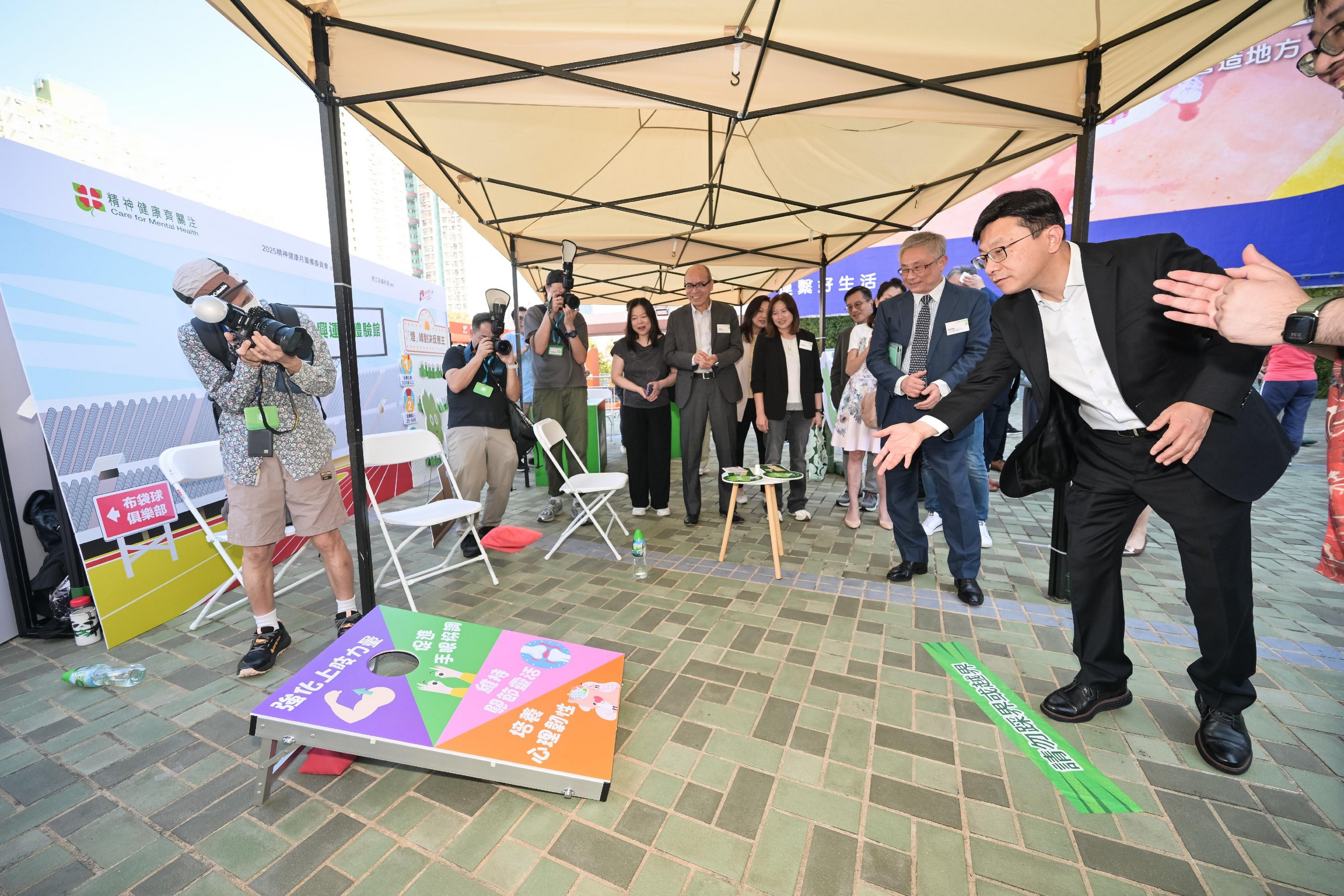 勞工及福利局局長孫玉菡今日(十月十一日)為「齊賀國慶76周年.2025精神健康月啟動禮暨嘉年華」主禮。精神健康月由勞工及福利局聯同多個決策局/部門、公營機構及非政府機構合辦,以響應世界心理衞生聯盟發起的「世界精神衞生日」。2025精神健康月以「活.好D」為主題,希望透過不同形式的公眾教育及推廣活動,提升市民對健康生活方式的認識與重視。圖示孫玉菡(右一)參與推廣「恆常運動」的遊戲攤位。
