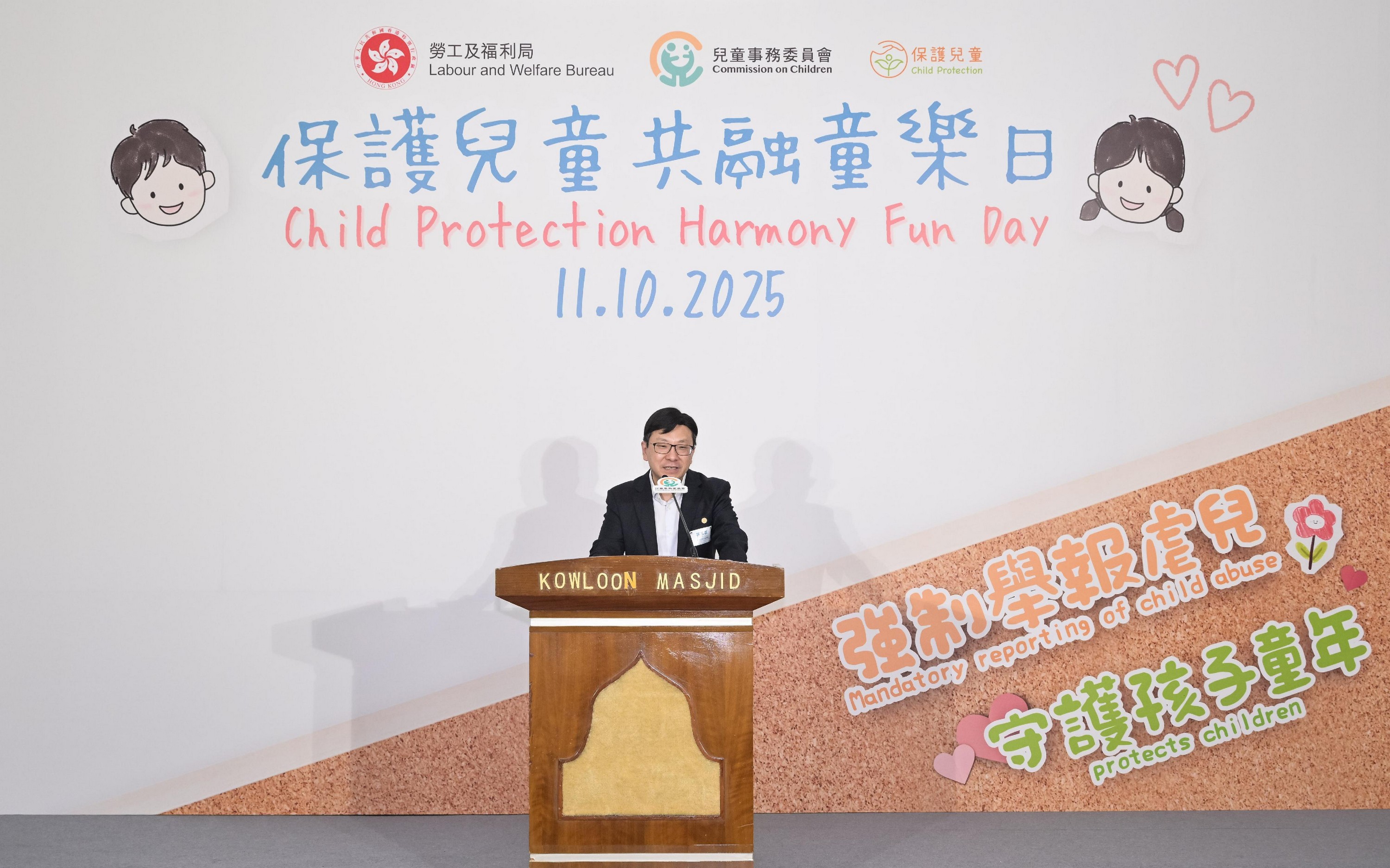 兒童事務委員會今日(十月十一日)舉行「保護兒童共融童樂日」公眾參與活動,為《強制舉報虐待兒童條例》於明年一月二十日生效進行100日倒數。勞工及福利局局長兼兒童事務委員會副主席孫玉菡、警務處處長周一鳴、社會福利署署長杜永恒和香港回教信託基金總會主席沙意一同為活動主禮。圖示杜永恒在開幕環節上致辭。