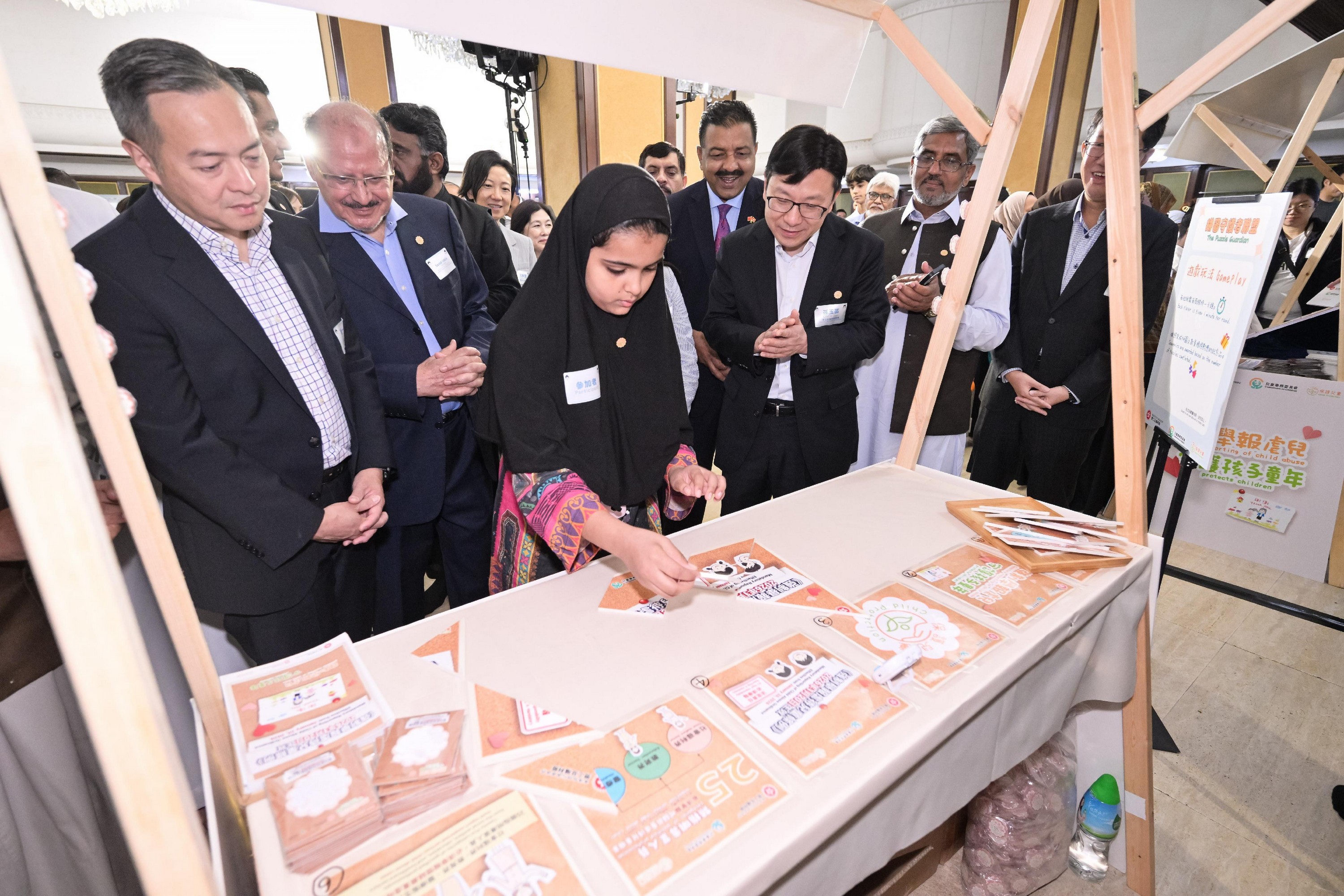 兒童事務委員會今日(十月十一日)舉行「保護兒童共融童樂日」公眾參與活動,為《強制舉報虐待兒童條例》於明年一月二十日生效進行100日倒數。勞工及福利局局長兼兒童事務委員會副主席孫玉菡、警務處處長周一鳴、社會福利署署長杜永恒和香港回教信託基金總會主席沙意一同為活動主禮。圖示孫玉菡(右三)參觀推廣保護兒童的遊戲攤位。