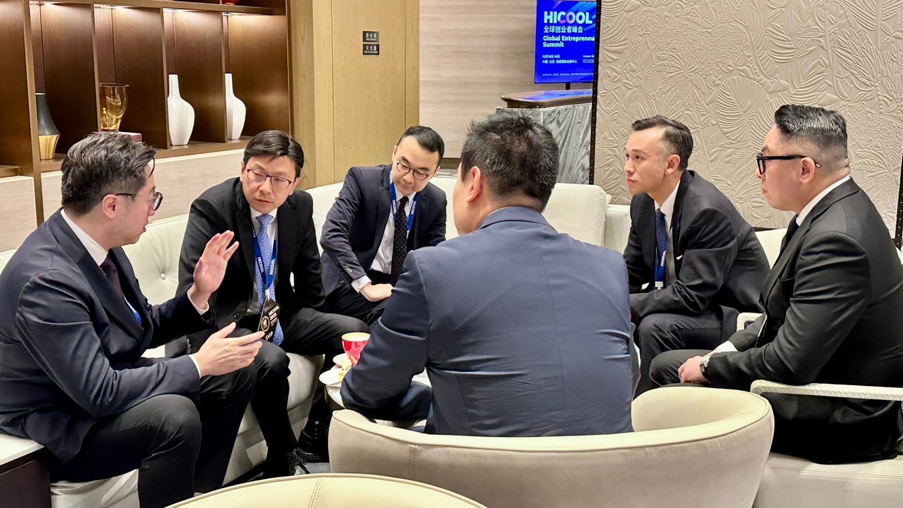 勞工及福利局局長孫玉菡今日(十月十七日)結束為期兩天的北京訪問行程,香港人才服務辦公室總監陳海勁亦有隨行。圖示孫玉菡(左二)和陳海勁(右二)昨日(十月十六日)與HICOOL 2025全球創業者峰會的香港參展企業代表茶敘,了解他們對人才發展的看法。
