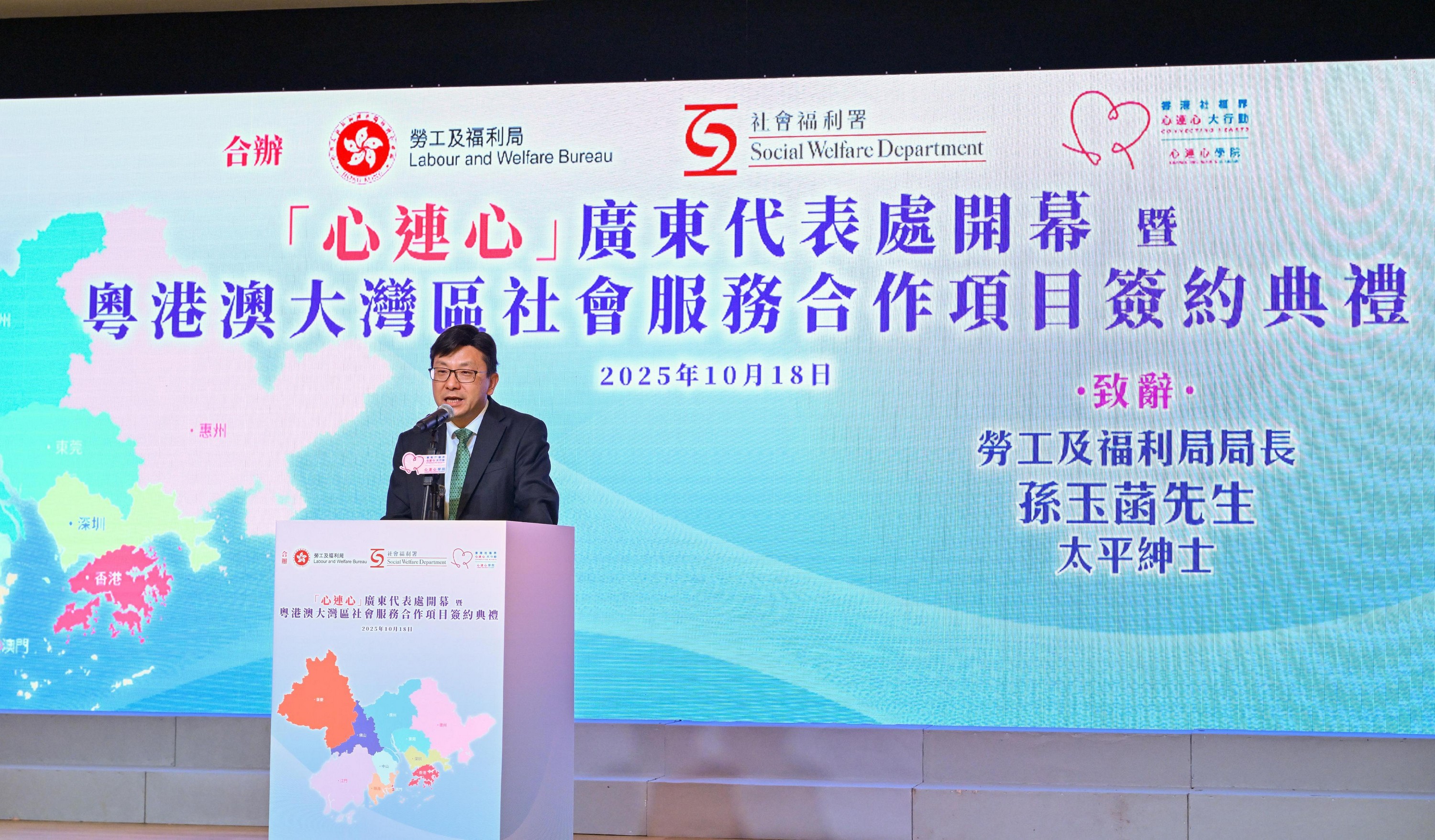勞工及福利局局長孫玉菡今日(十月十八日)為「心連心」廣東代表處開幕暨粵港澳大灣區社會服務合作項目簽約典禮主禮。圖示孫玉菡在典禮上致辭。