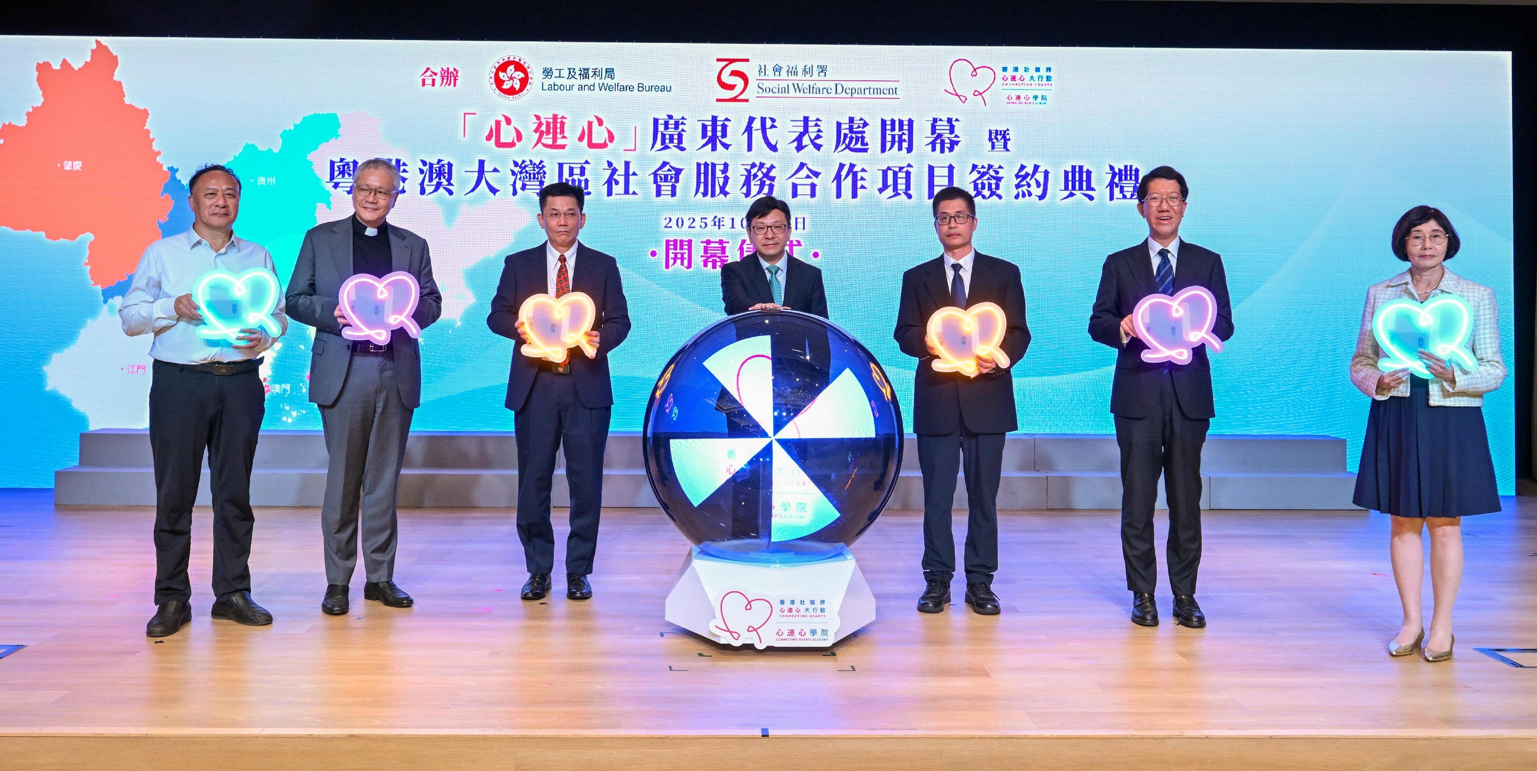 勞工及福利局局長孫玉菡今日(十月十八日)為「心連心」廣東代表處開幕暨粵港澳大灣區社會服務合作項目簽約典禮主禮。圖示(左起)廣東省志願服務聯合會副會長吳祖清、香港社福界「心連心」大行動主席、立法會議員管浩鳴、中央人民政府駐香港特別行政區聯絡辦公室社會工作部副部長周和博士、孫玉菡、廣東省委社會工作部副部長王利春、社會福利署署長杜永恒和香港社福界「心連心」大行動副主席、「心連心」學院院長譚贛蘭教授主持廣東代表處開幕儀式。