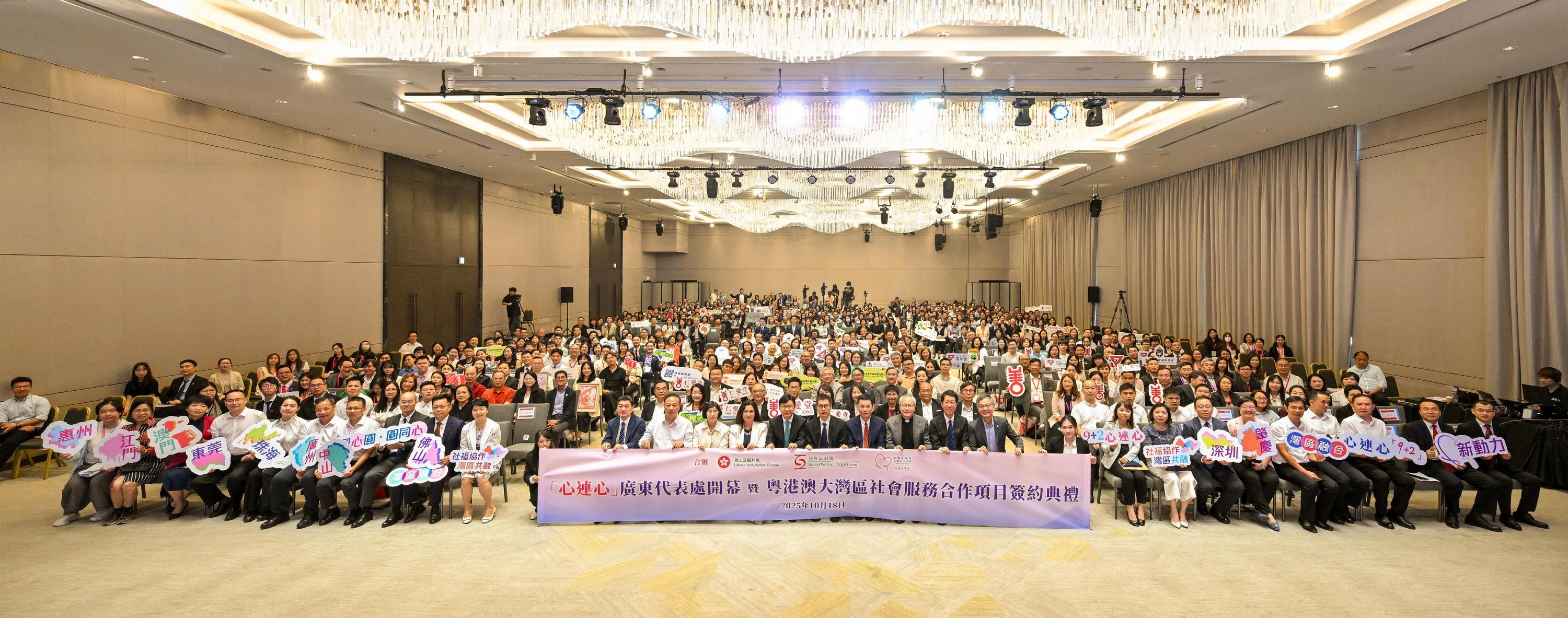 勞工及福利局局長孫玉菡今日(十月十八日)為「心連心」廣東代表處開幕暨粵港澳大灣區社會服務合作項目簽約典禮主禮。圖示孫玉菡和其他嘉賓在典禮上與出席者大合照。