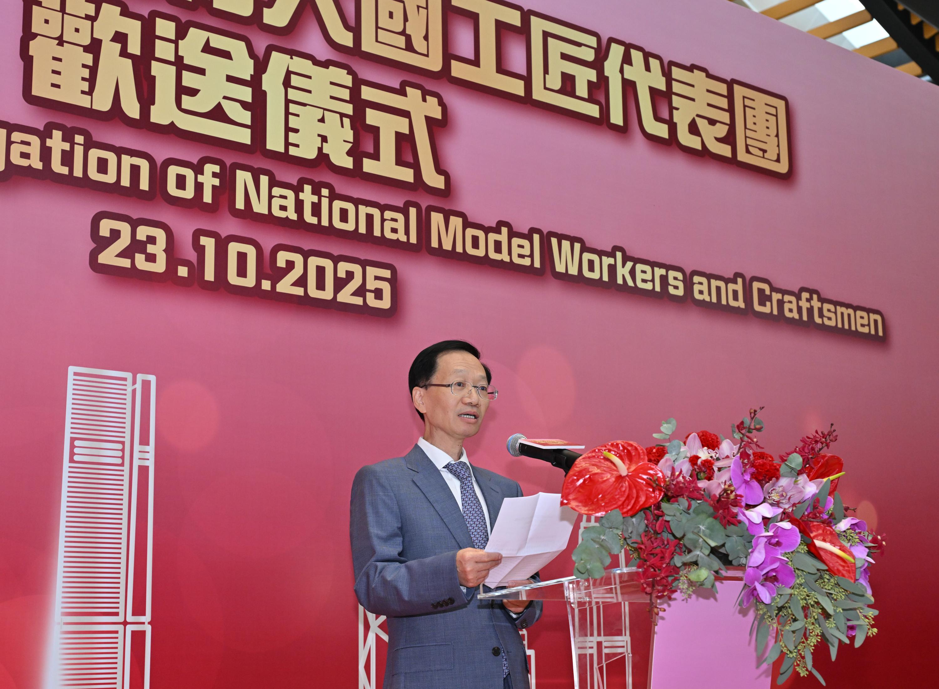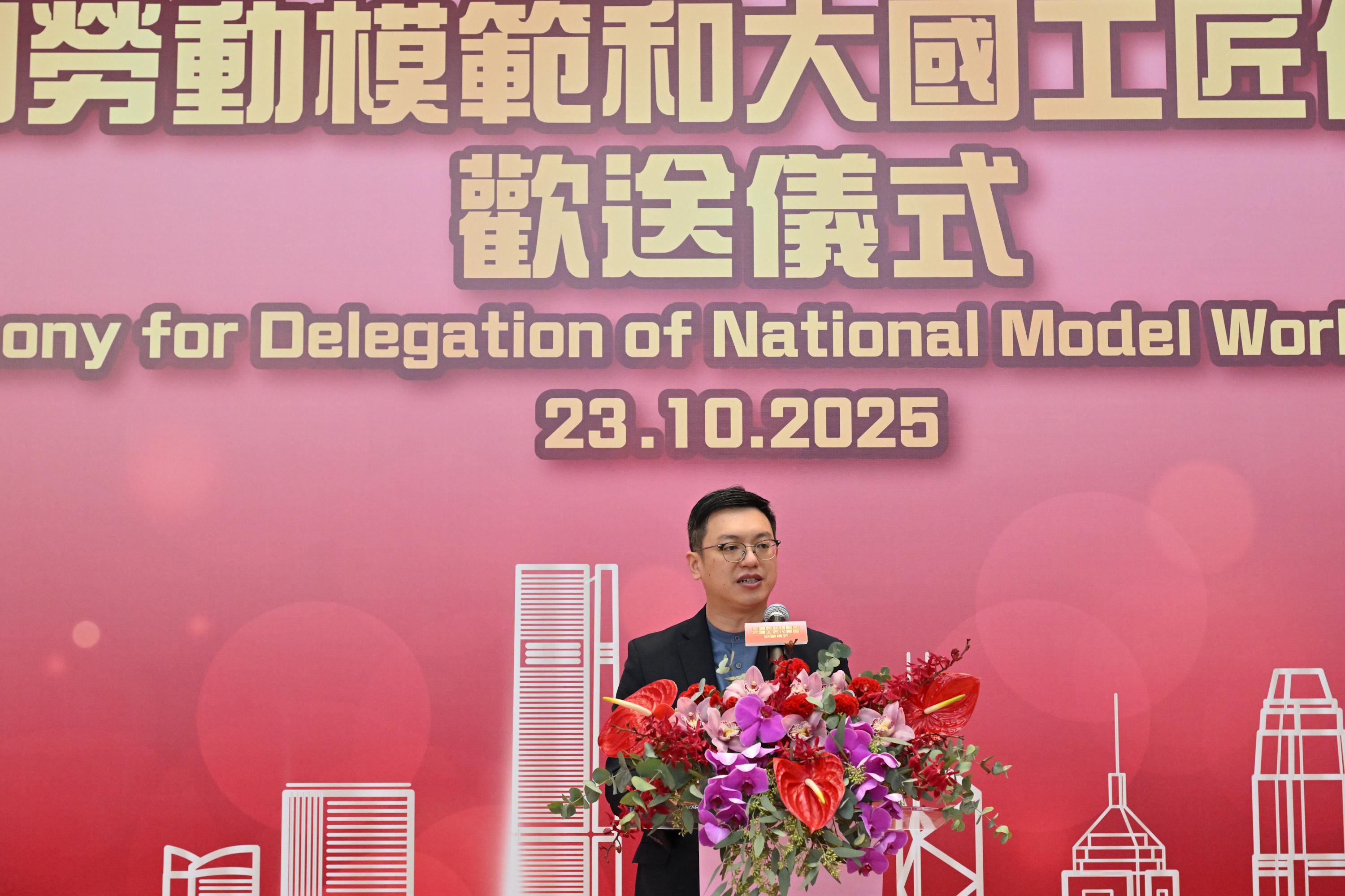 全國勞動模範和大國工匠代表團今日(十月二十三日)上午完成四日訪港行程。代表團離港前,香港特別行政區政府在港珠澳大橋香港口岸舉行歡送儀式。圖示勞工及福利局副局長何啟明在儀式上致辭。
