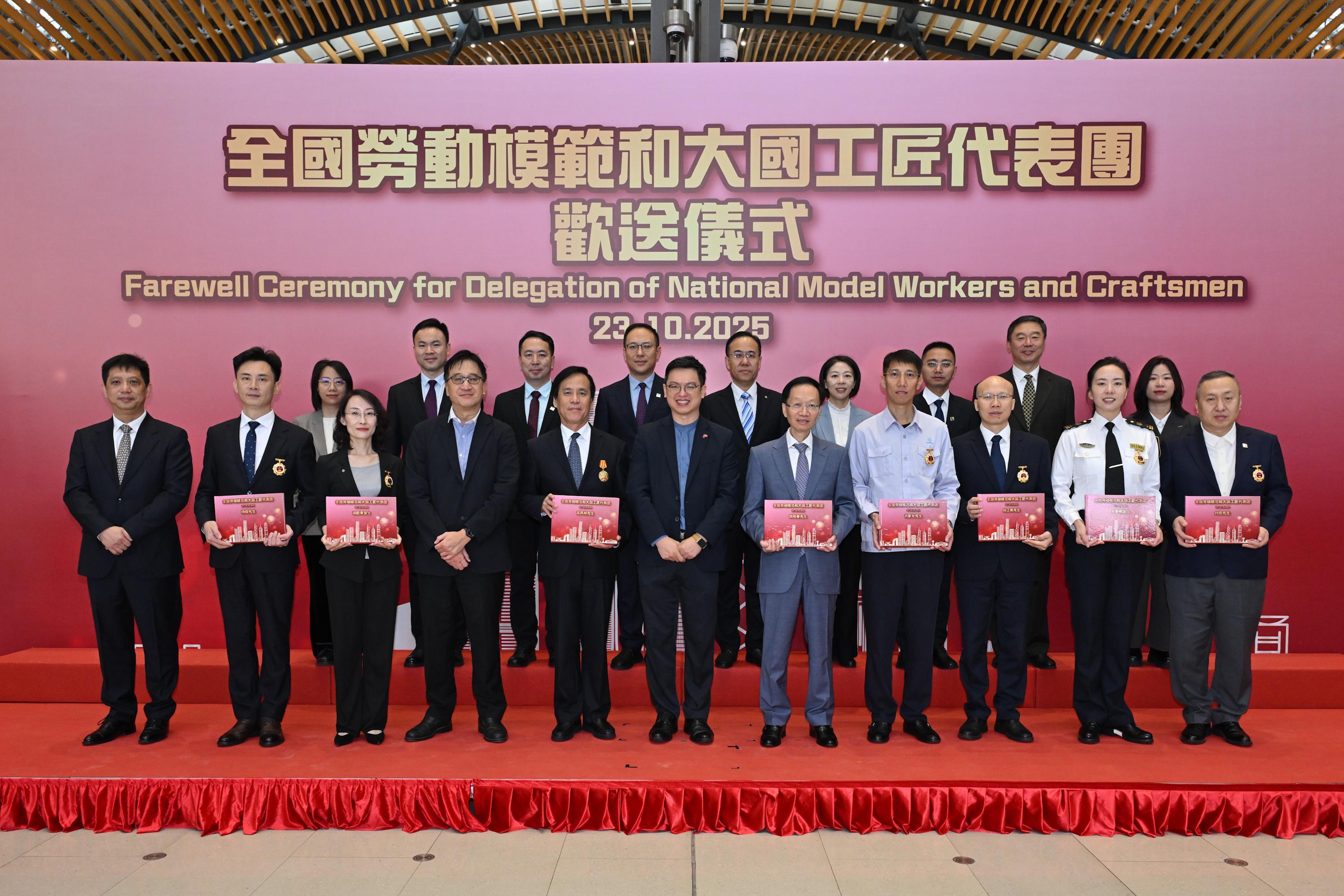 全國勞動模範和大國工匠代表團今日(十月二十三日)上午完成四日訪港行程。代表團離港前,香港特別行政區政府在港珠澳大橋香港口岸舉行歡送儀式。圖示勞工及福利局副局長何啟明(前排中)、中央人民政府駐香港特別行政區聯絡辦公室社會工作部副部長吳小玔(前排左一)和勞工處副處長(勞工事務行政)何錦標(前排左四)與代表團團長、中華全國總工會副主席魏地春(前排右五)及其他代表團成員在歡送儀式合照。
