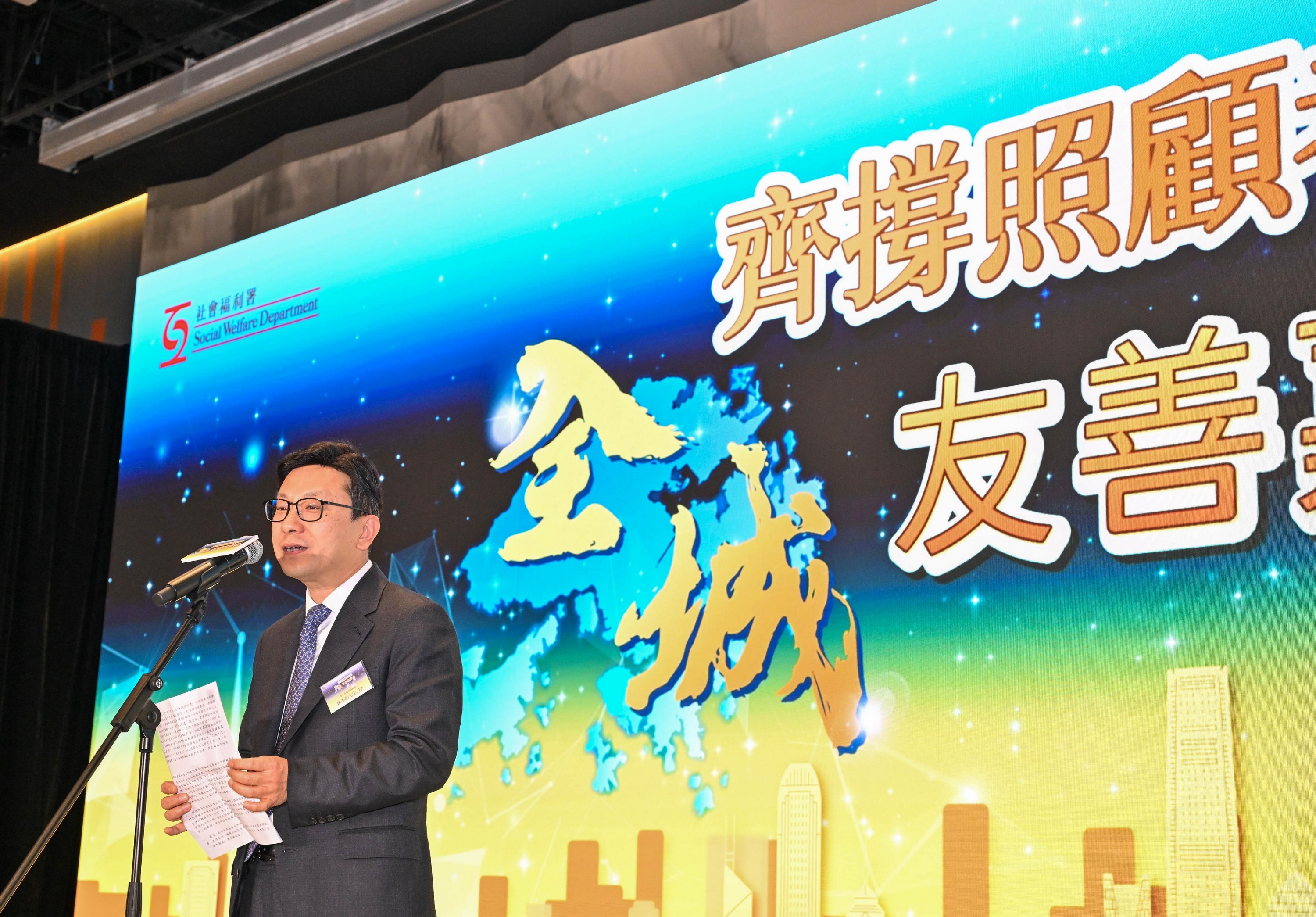 社會福利署今日(一月十三日)舉辦「齊撐照顧者行動—全城友善嘉許禮」,表揚照顧者及積極支援照顧者的鄰舍和僱主,並呼籲社會各界繼續支持和關懷照顧者。圖示勞工及福利局局長孫玉菡在嘉許禮上致辭。
