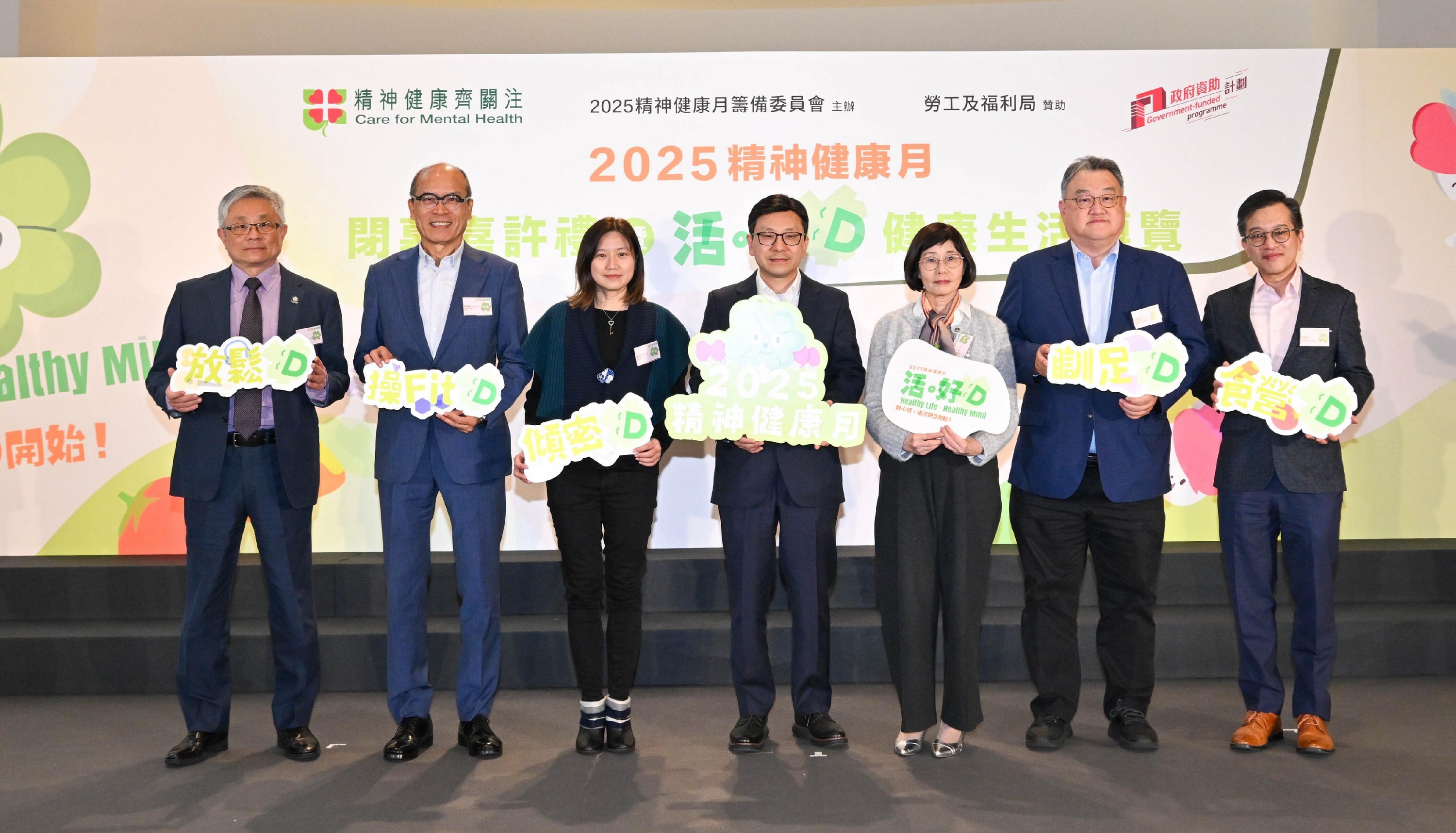 勞工及福利局局長孫玉菡今日(一月十七日)為「2025精神健康月」閉幕嘉許禮暨「活。好D」健康生活博覽主禮。圖示(左起)「2025精神健康月」籌備委員會主席朱世明、康復諮詢委員會副主席劉健華博士、勞工及福利局康復專員姜梁詠怡、孫玉菡、心連心學院院長譚贛蘭教授、康復諮詢委員會屬下康復服務公眾教育小組委員會主席于健安及社會福利署助理署長(康復及醫務社會服務)吳偉龍為活動主禮。