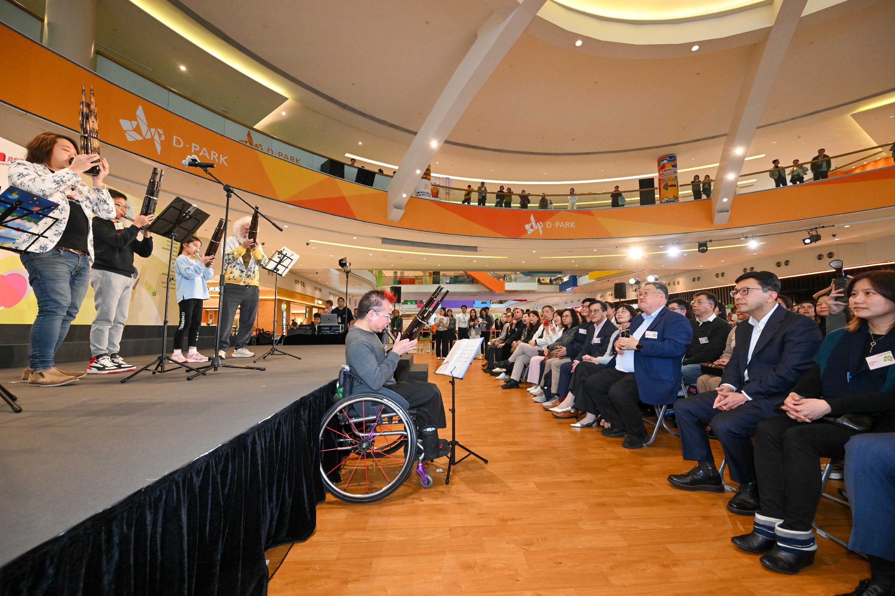 勞工及福利局局長孫玉菡今日(一月十七日)為「2025精神健康月」閉幕嘉許禮暨「活。好D」健康生活博覽主禮。圖示孫玉菡(右二)欣賞共融音樂表演。