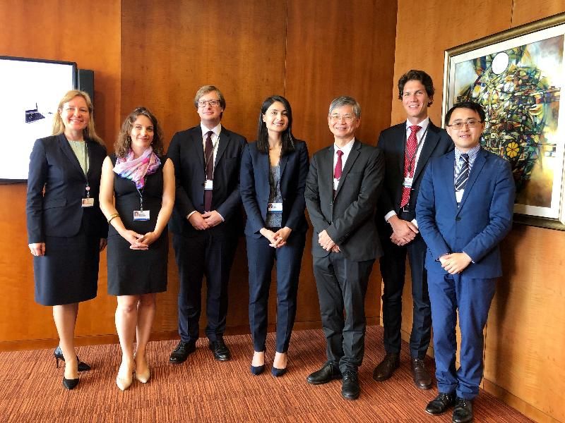 勞工及福利局局長羅致光博士今日(日內瓦時間六月十八日)上午在瑞士日內瓦趁國際勞工組織百年大會會議間隙,與世界經濟論壇系統行動倡議管理委員會成員會面,就如何應對人工智能時代交換意見。圖示羅致光博士(右三)和香港駐柏林經濟貿易辦事處處長李志鵬(右一)與世界經濟論壇新經濟與社會中心主任薩迪亞‧扎希迪(中)及團隊成員合照。