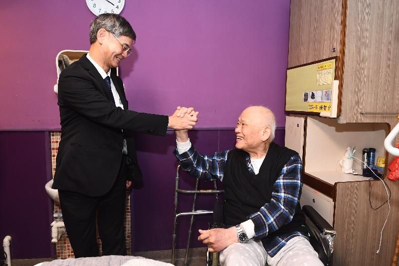 勞工及福利局局長羅致光博士到訪保良局灣仔護老院暨長者日間護理中心。圖示羅致光博士(左)與中心長者交流。